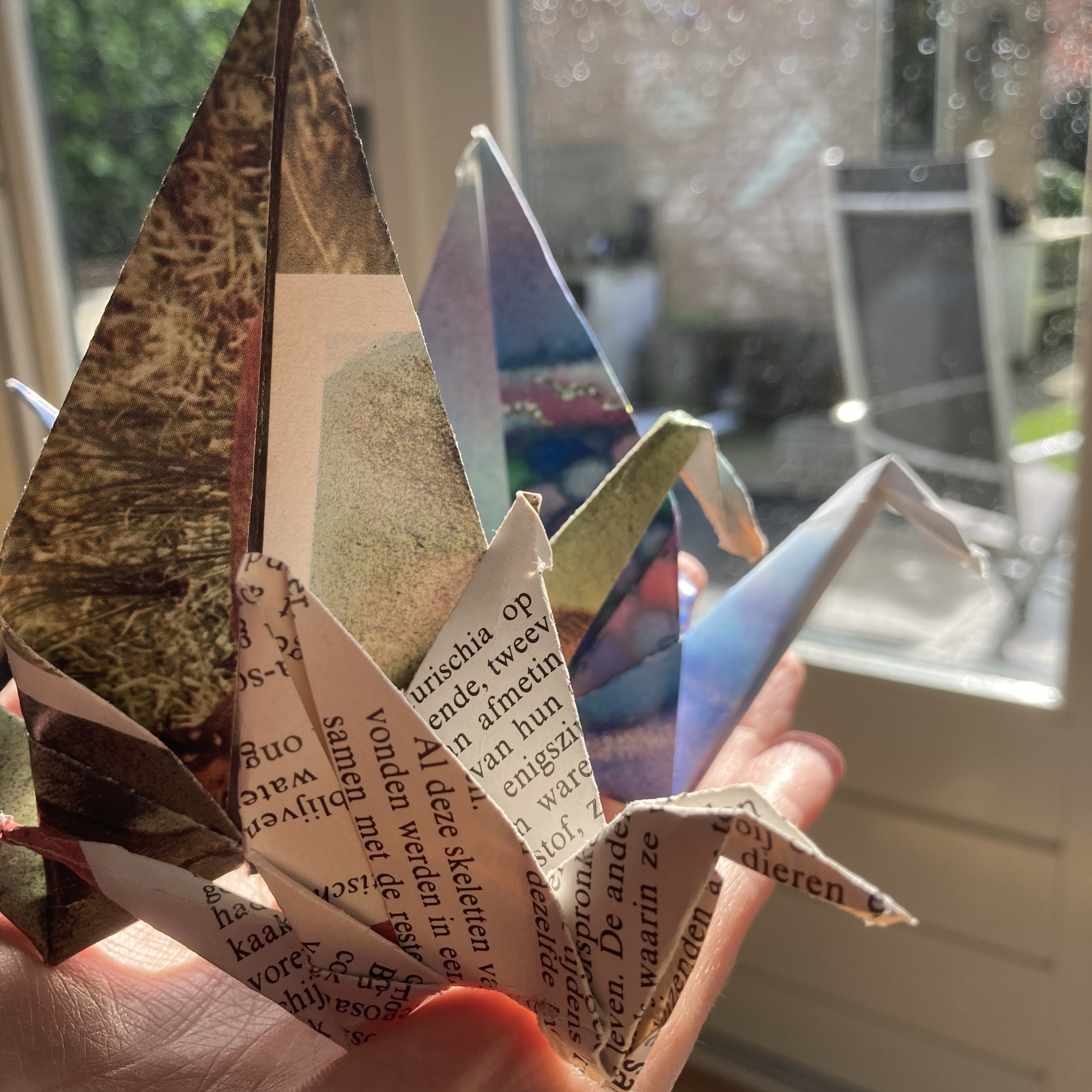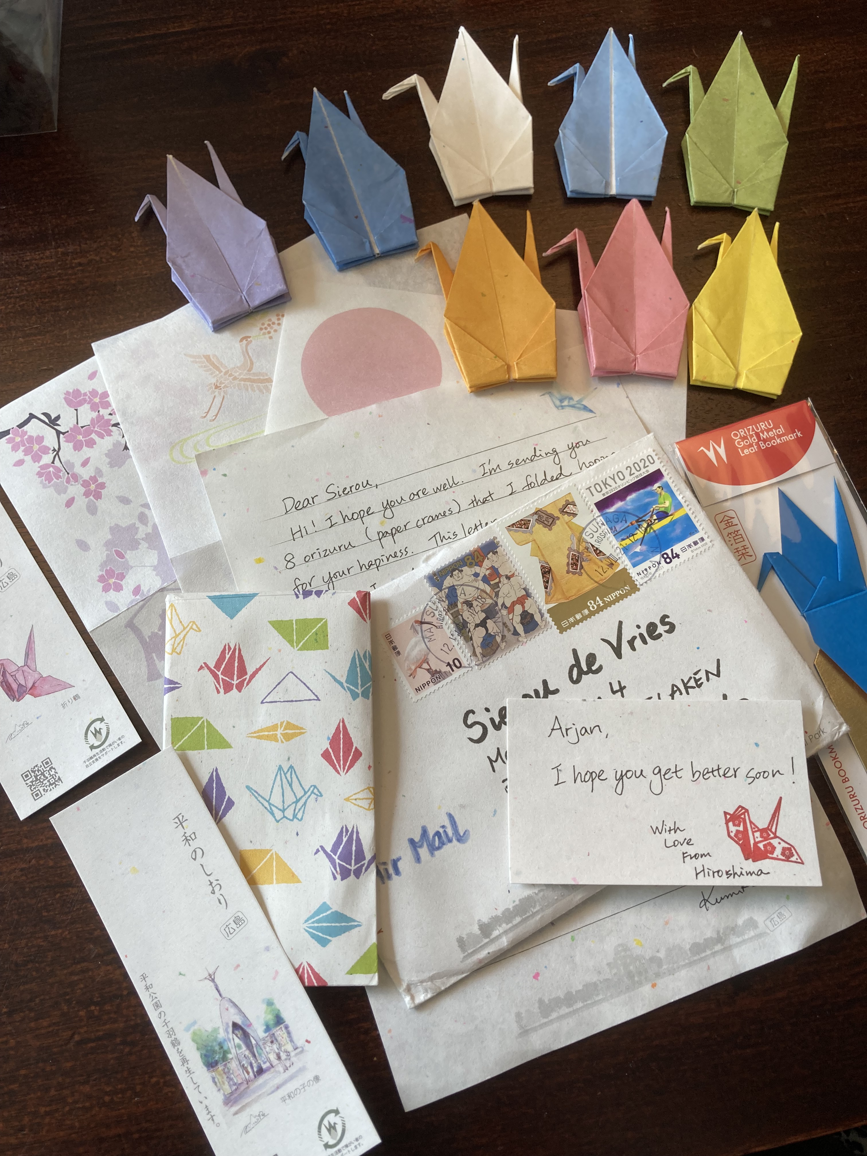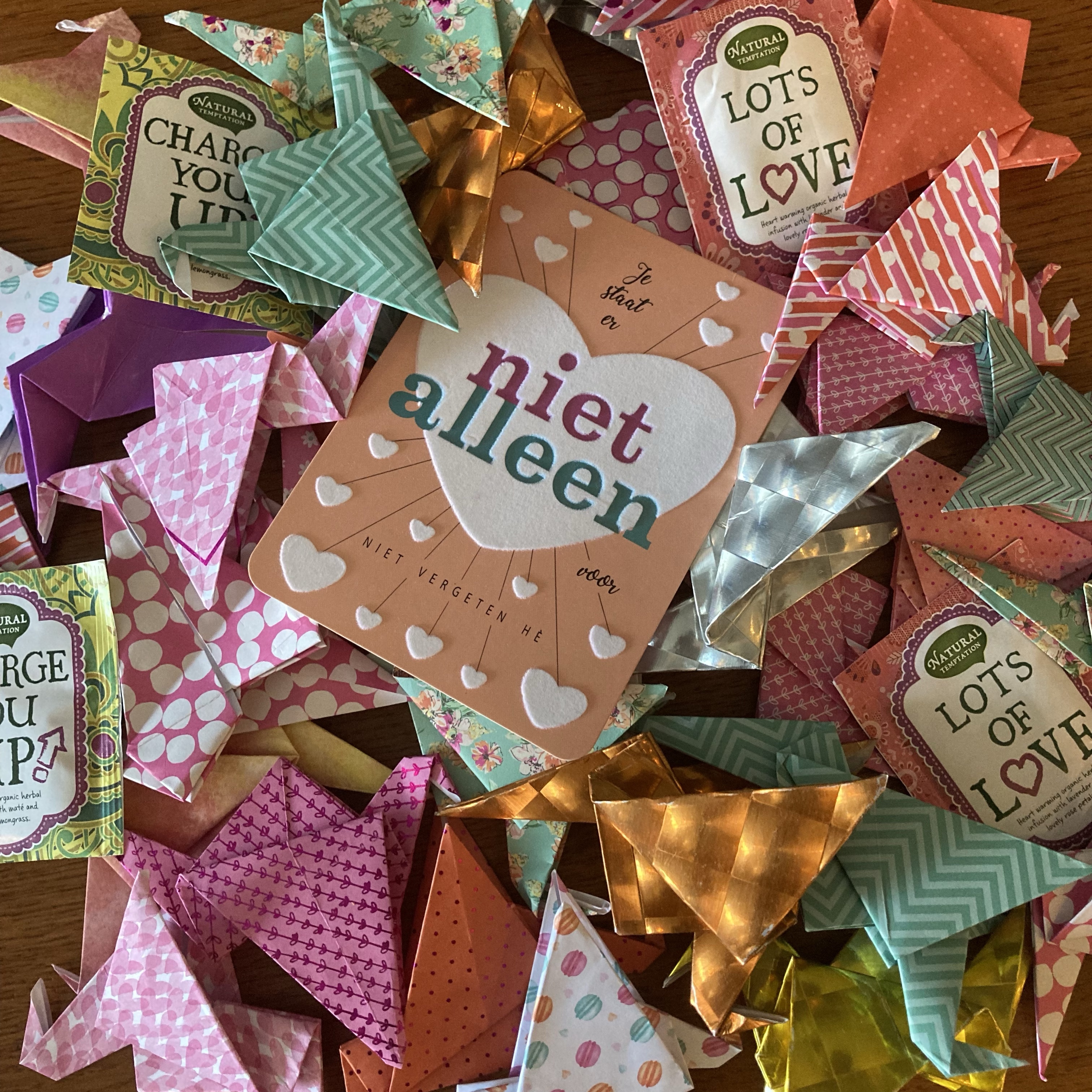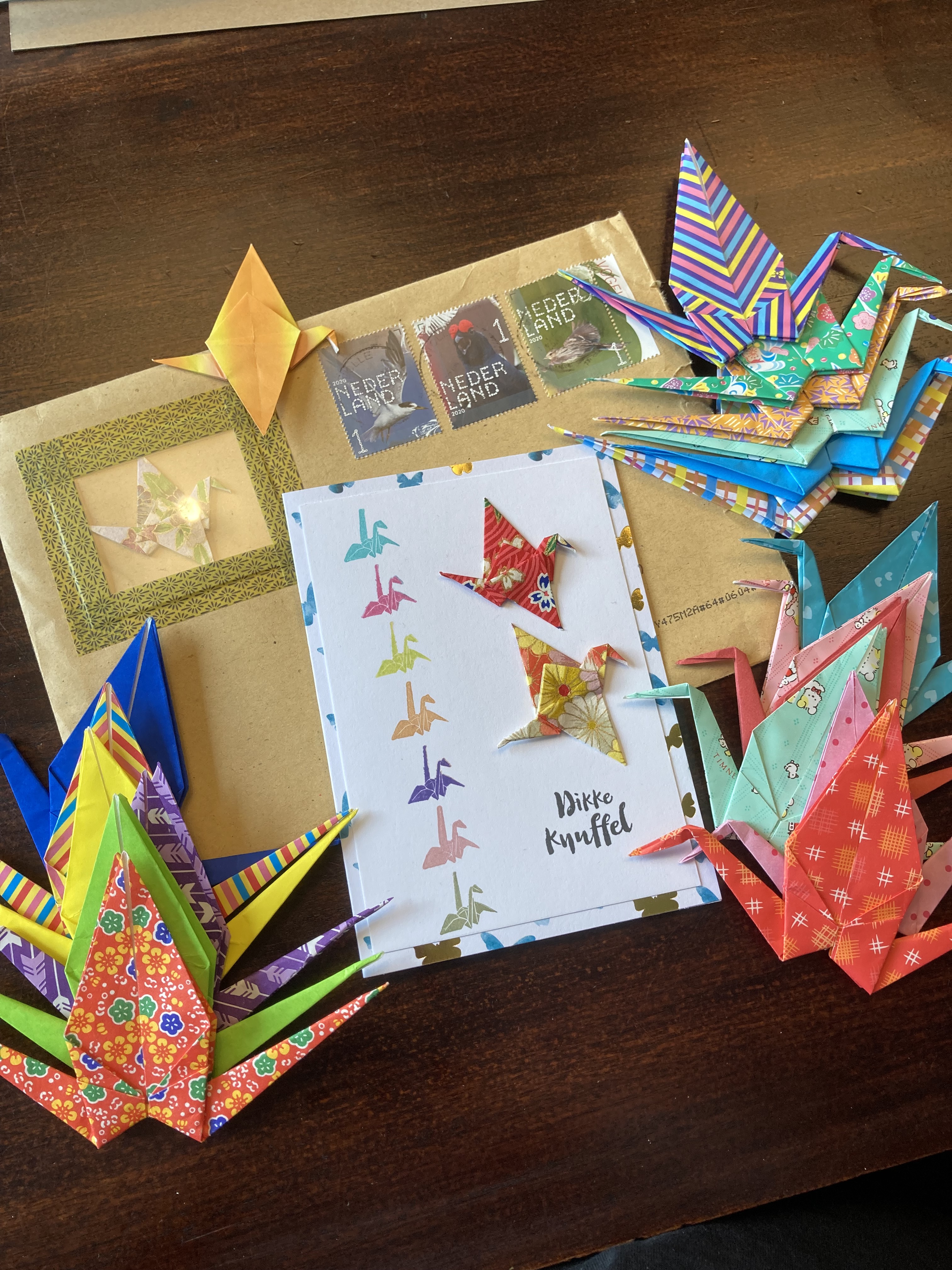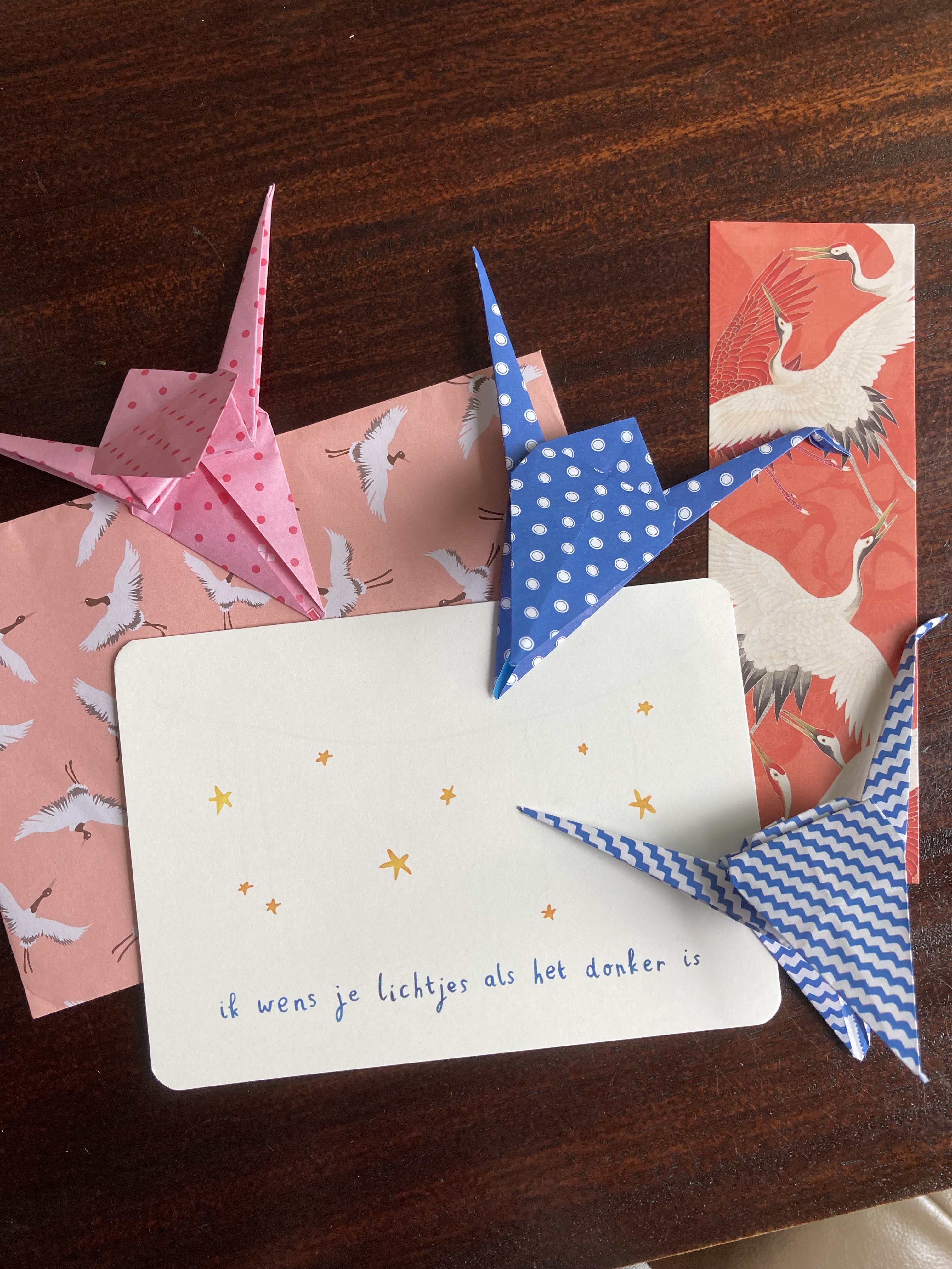 En in dit geval geeft het ons (Sierou, Tijmen & Simme)een doel én iets te doen. Iets doen voor Arjan. Waar we eigenlijk niets kunnen doen. En gaandeweg het vouwen, het maken van de slingers merken we dat het therapeutisch is om 1000 kraanvogels bij elkaar te krijgen om één grote slinger te maken. We vouwen samen, we rijgen samen. We lezen onze post samen.