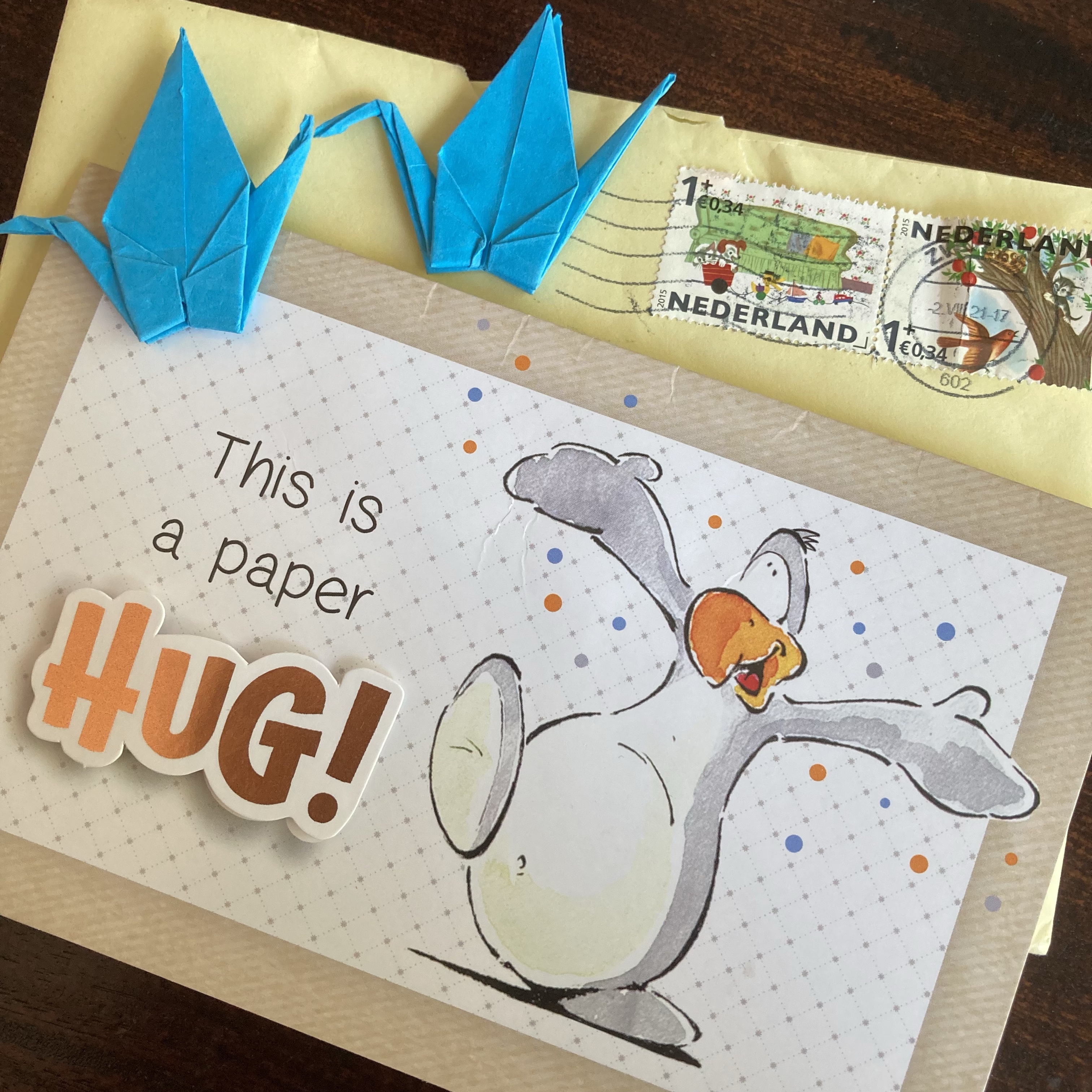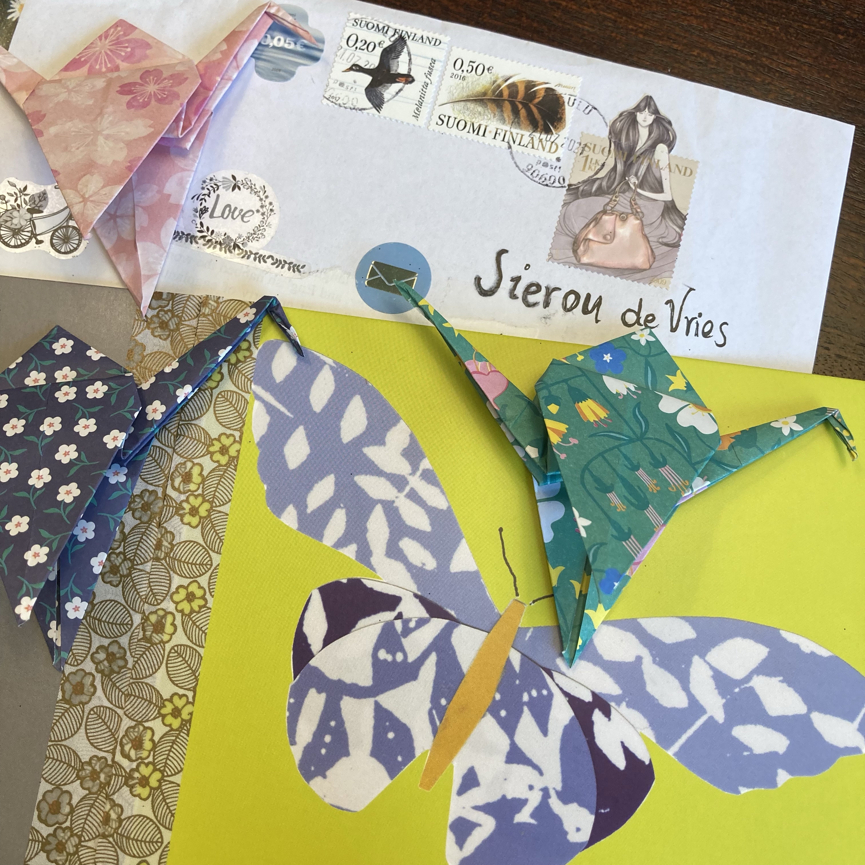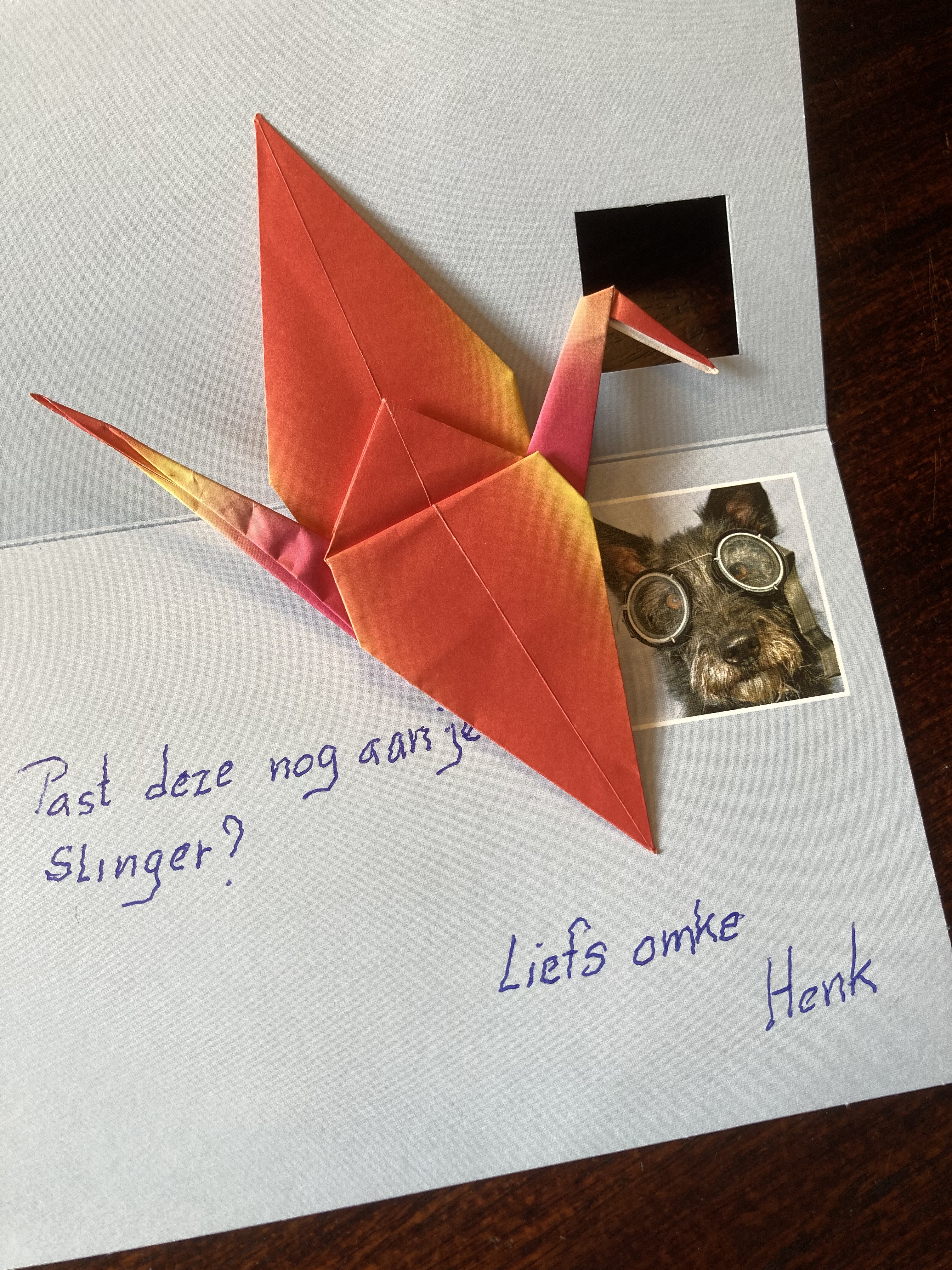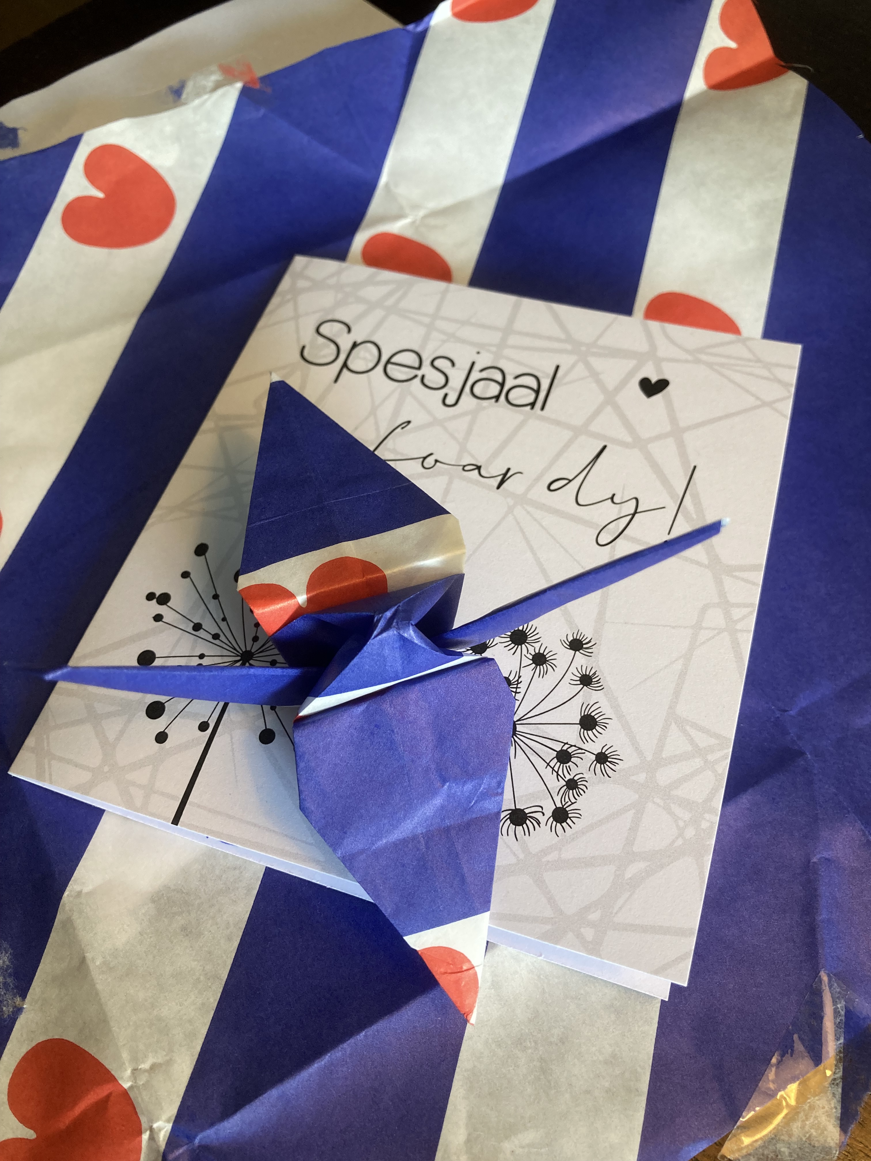En in dit geval geeft het ons (Sierou, Tijmen & Simme)een doel én iets te doen. Iets doen voor Arjan. Waar we eigenlijk niets kunnen doen. En gaandeweg het vouwen, het maken van de slingers merken we dat het therapeutisch is om 1000 kraanvogels bij elkaar te krijgen om één grote slinger te maken. We vouwen samen, we rijgen samen. We lezen onze post samen.