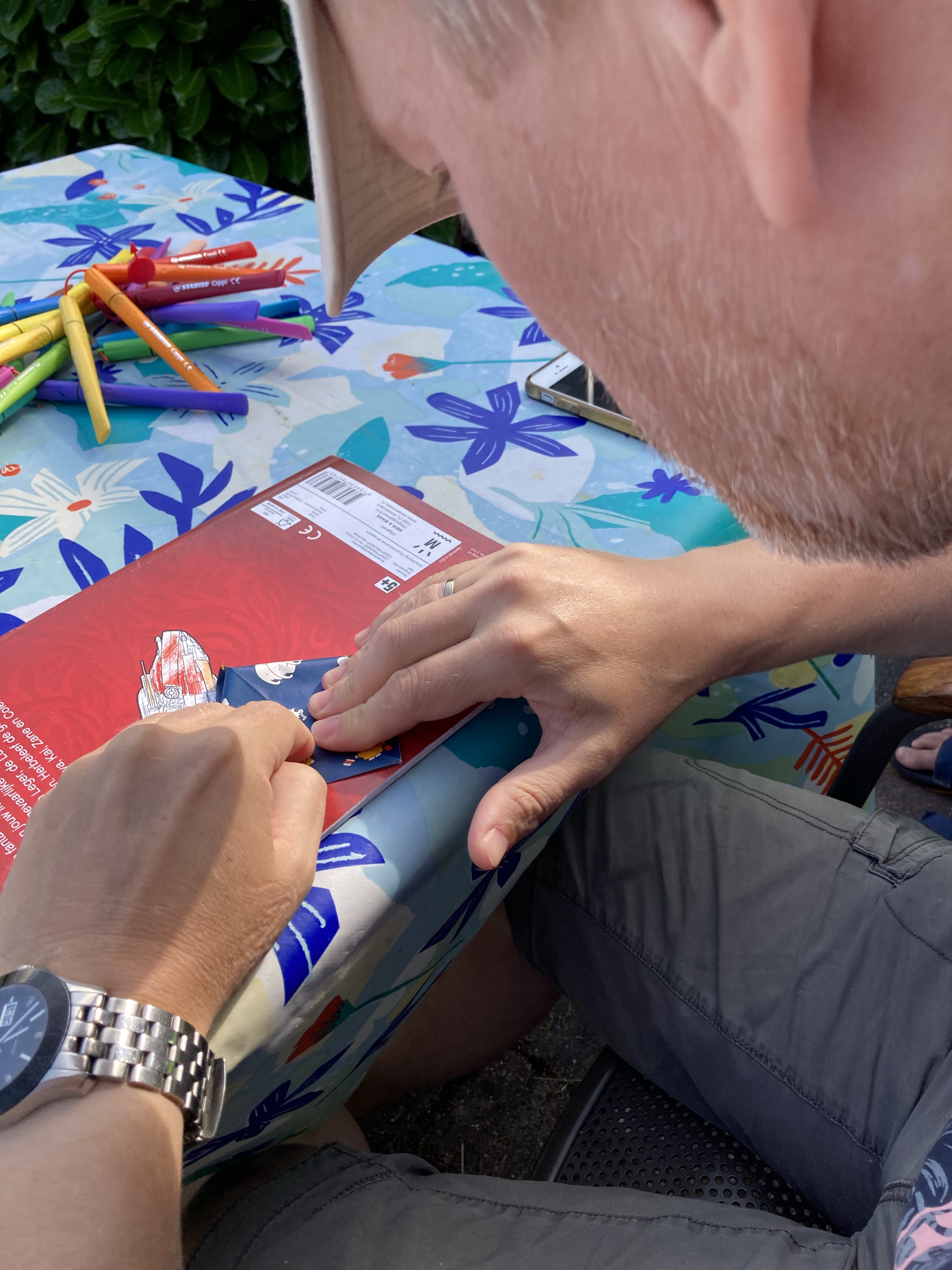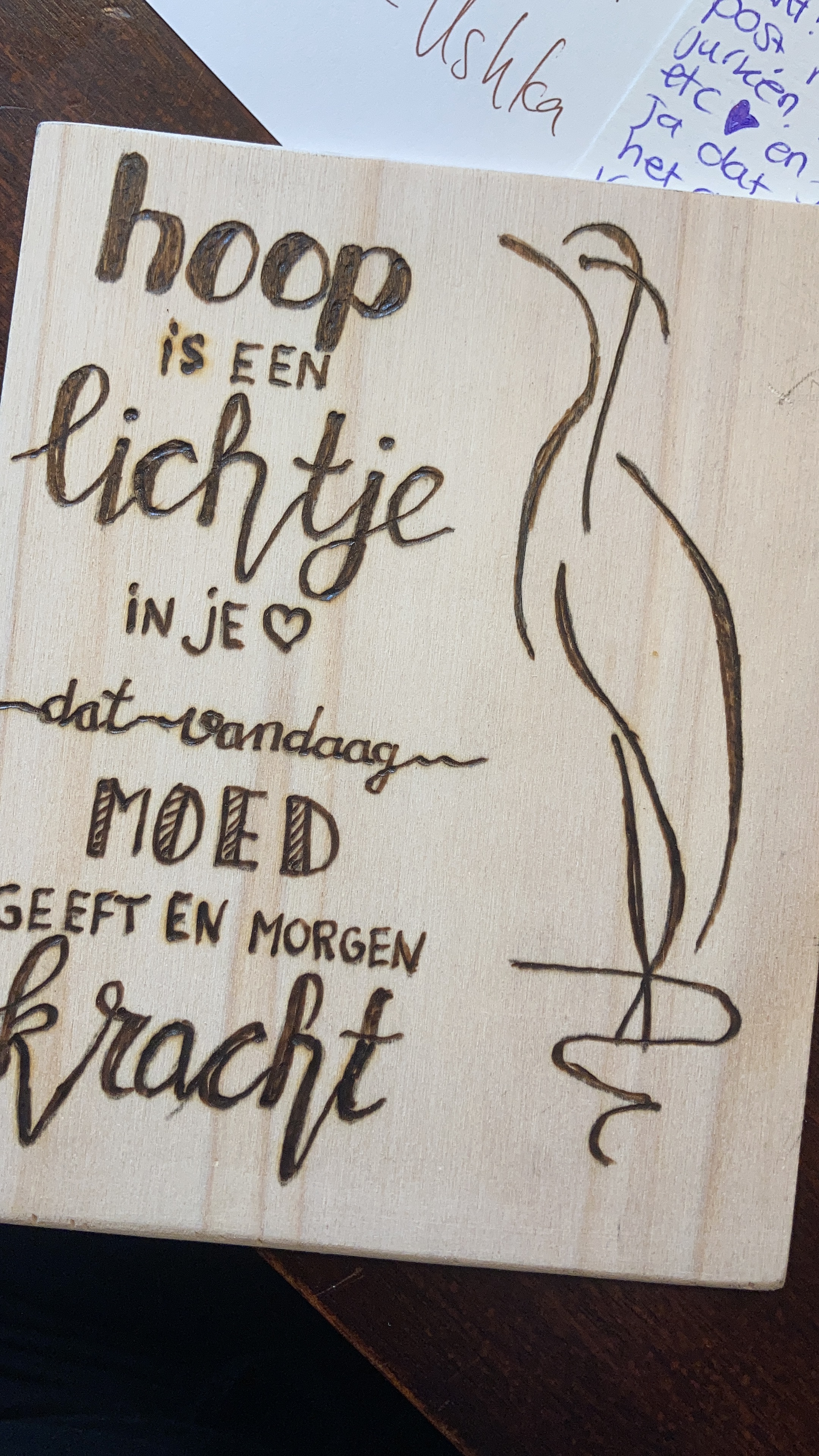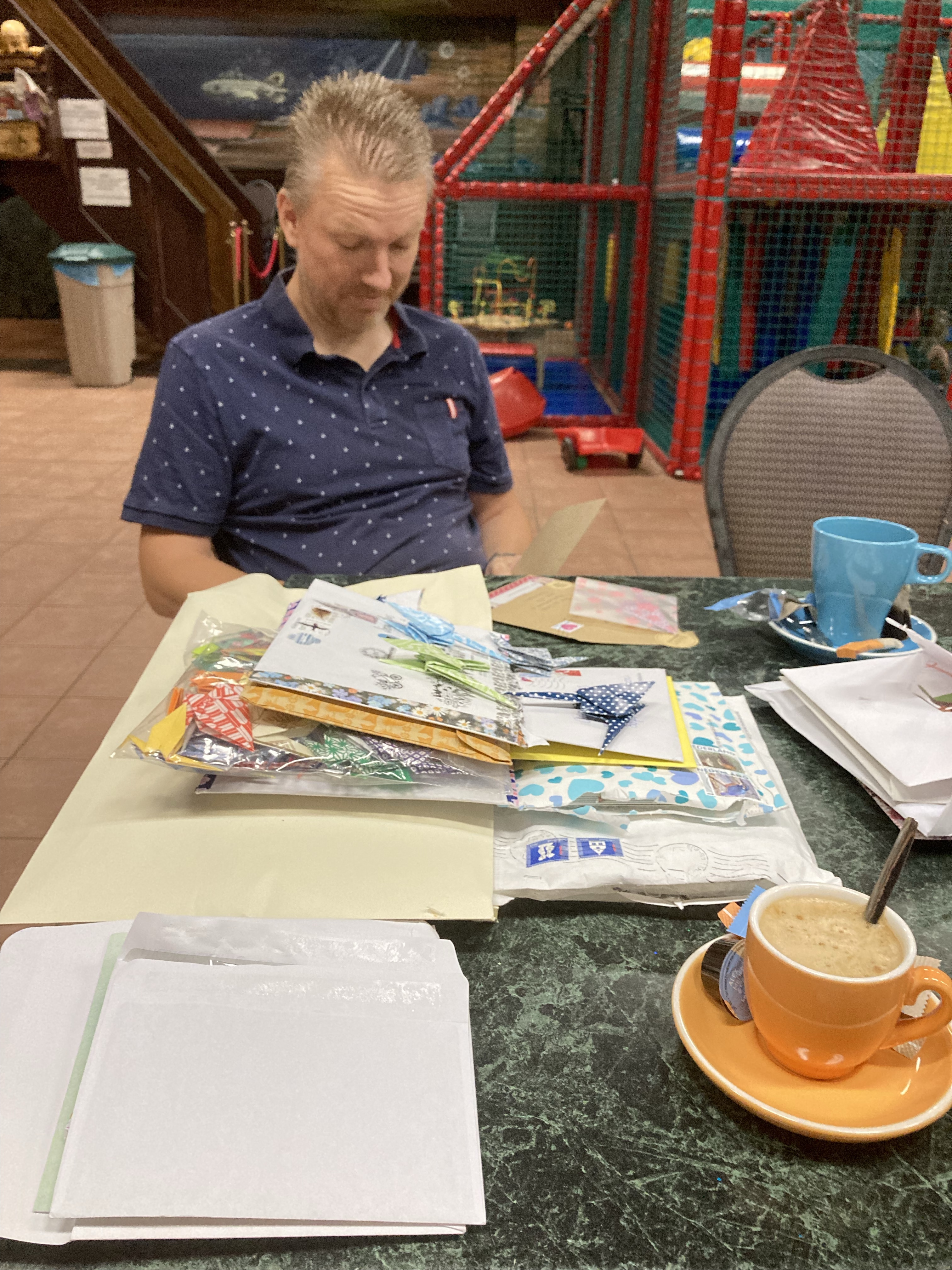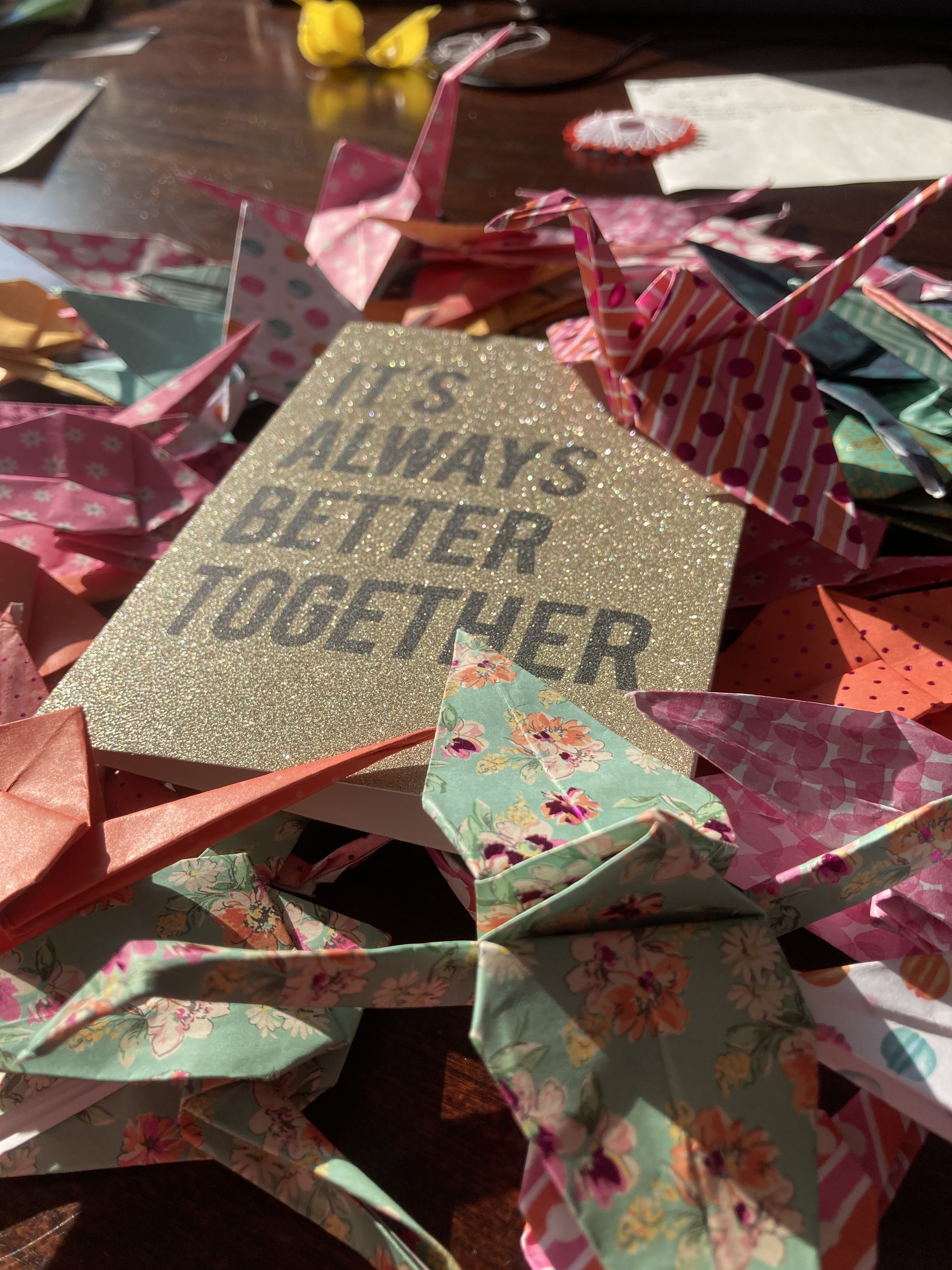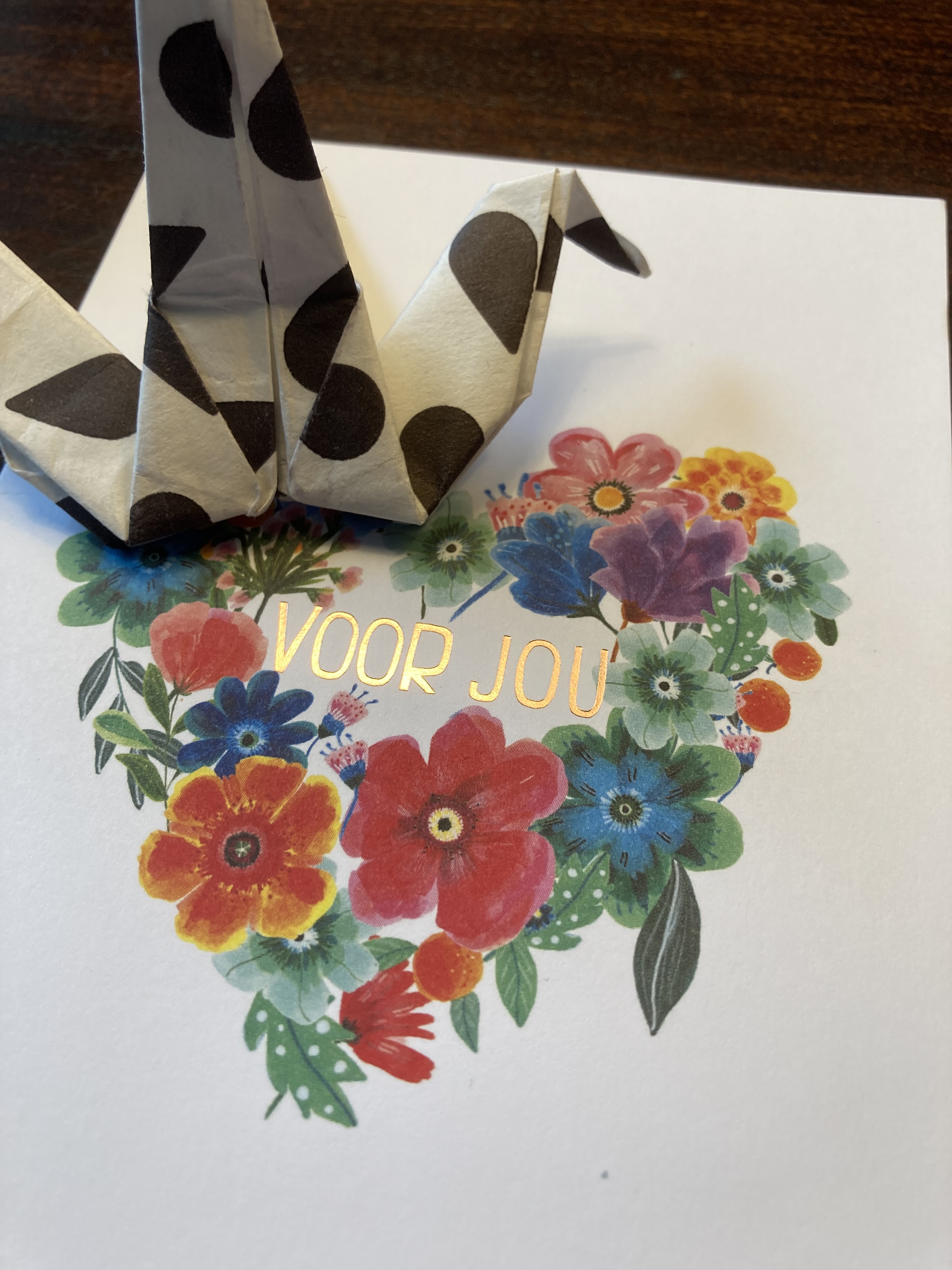 En in dit geval geeft het ons (Sierou, Tijmen & Simme)een doel én iets te doen. Iets doen voor Arjan. Waar we eigenlijk niets kunnen doen. En gaandeweg het vouwen, het maken van de slingers merken we dat het therapeutisch is om 1000 kraanvogels bij elkaar te krijgen om één grote slinger te maken. We vouwen samen, we rijgen samen. We lezen onze post samen.