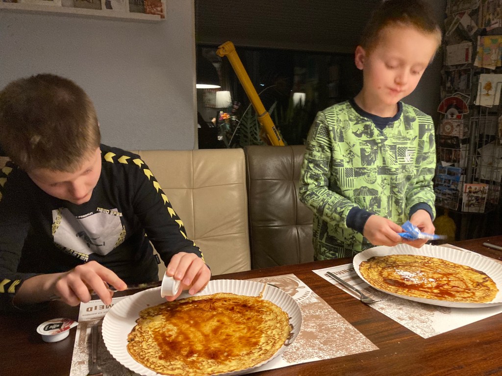 We vieren Arjan zijn thuiskomst met pannenkoeken van het pannenkoekenrestaurant!