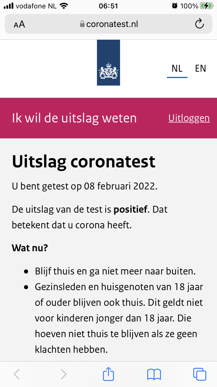 Dat spookt wel even door je hoofd. Ineens is alles toch spannend. Doet die vaccinatie wat hij moet doen? Hoe zit het met het CMV-virus wat actief is? Kan daar een corona-besmetting bij? Dinsdag hebben we een familie-uitje naar de GGD-teststraat. Inmiddels hoest ik er lekker op los…. en Arjan voelt zich nog steeds oké. Is al weken verkouden, mede door het CMV-virus. Ik verwacht niet veel bijzonders. Al snel blijkt: 3/4 positief. En een dag later nummer 4, Simme. Een geluk bij een ongeluk: allemaal tegelijk.