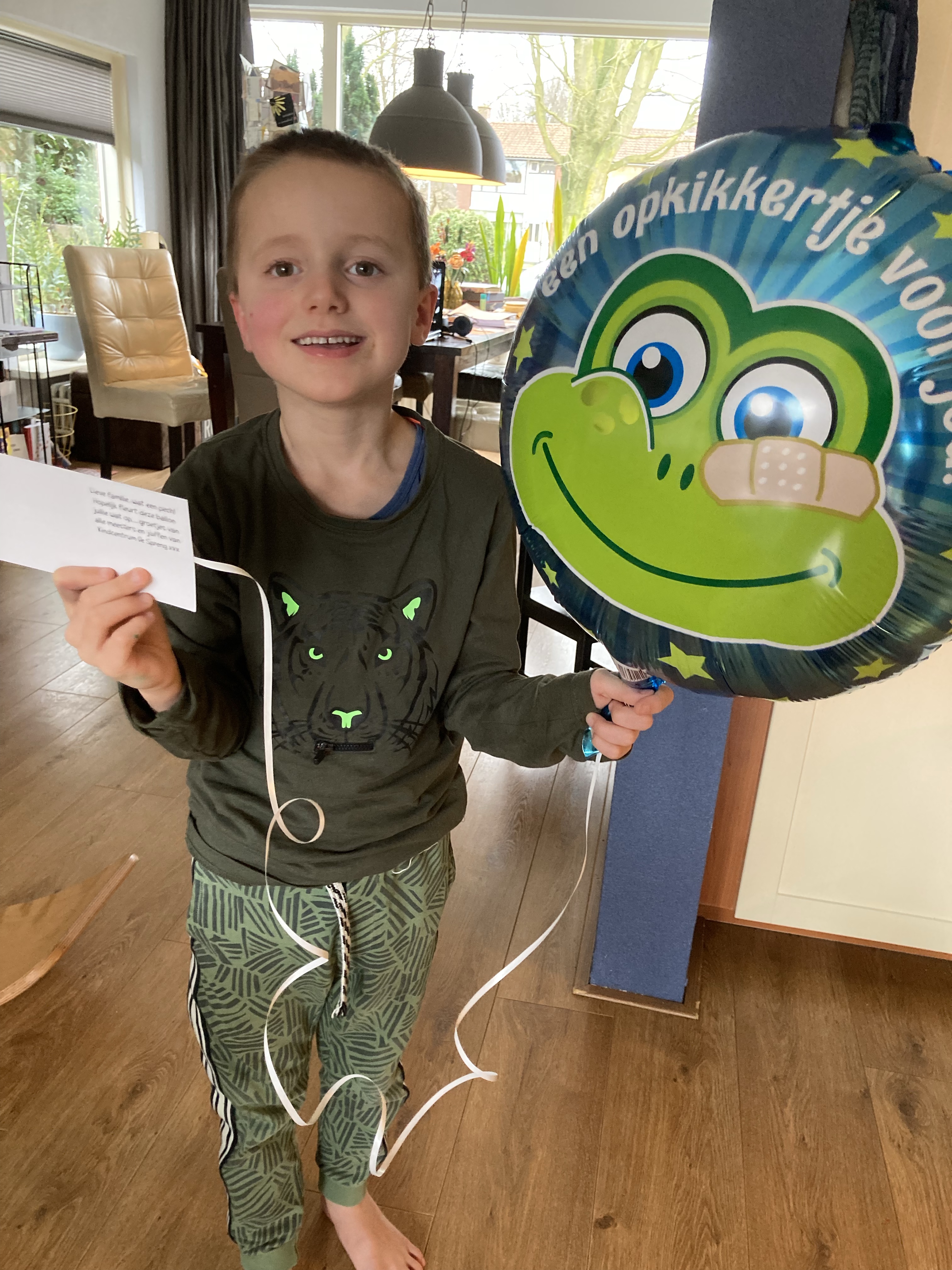 Het keiharde bewijs, een geweldige ballon van de juffen en meesters van school en Arjan onder zijn elektrische fleecedeken. Arjan heeft het sinds hij ziek is, altijd koud. Intens koud, dit houdt hem warm.