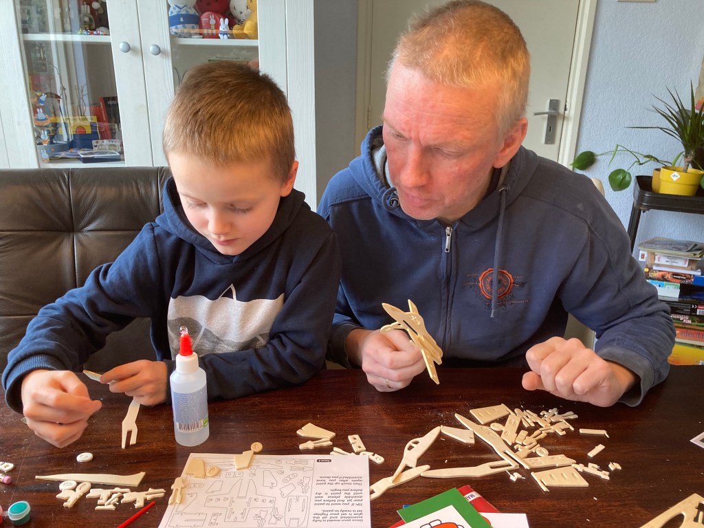 Tussen het hoesten door heeft Arjan met Simme zitten bouwen, is er les gegeven aan Simme (Tijmen zat de hele tijd online op zolder in zijn klas een volledige lesdag te volgen). En ik kon boven werken. (tekst onder foto verder)