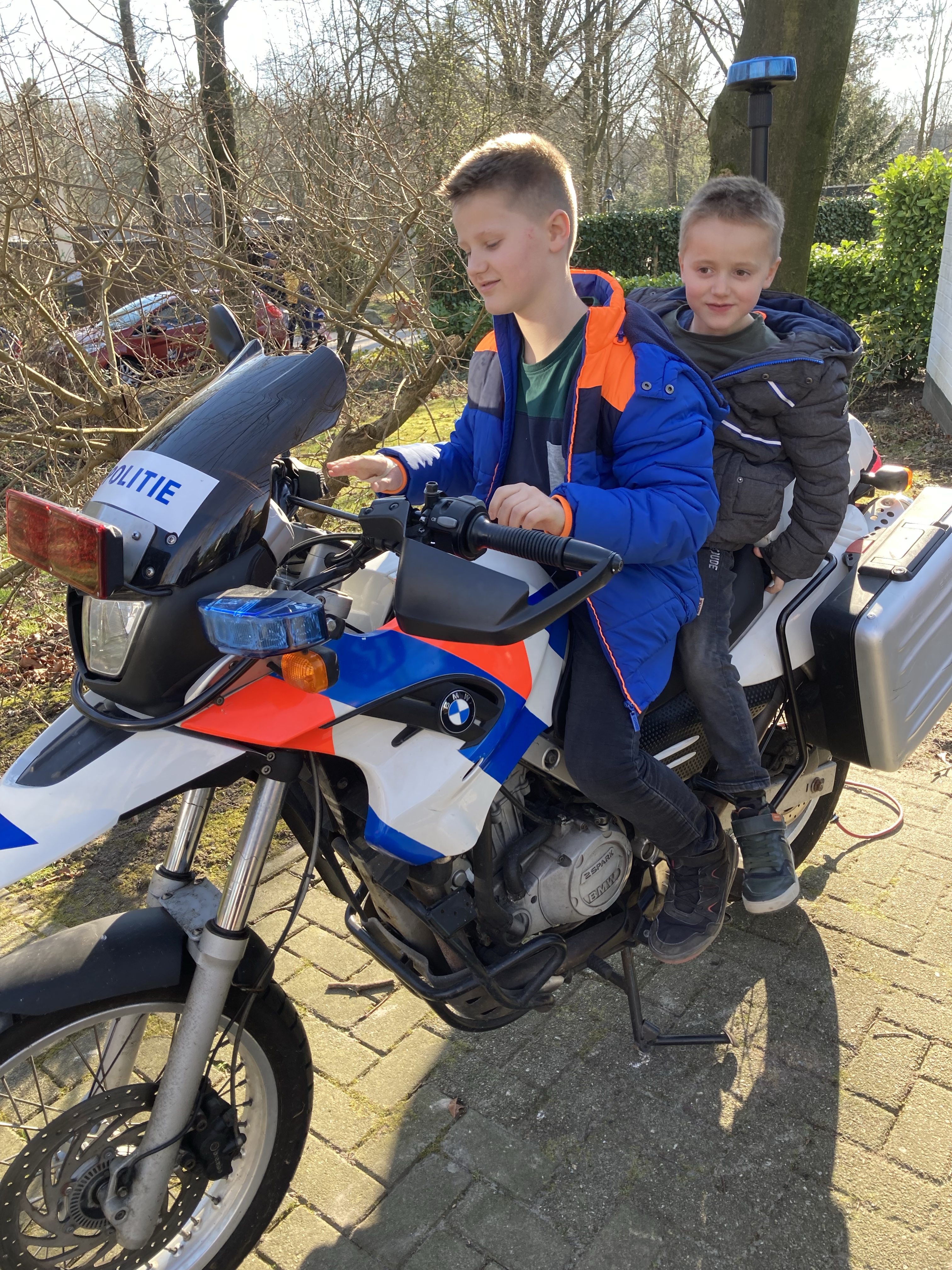 De middag vulde zich met lasergamen, een ME-busje bekogelen met blokken (agressie lekker kwijt), op een politiemotor zitten en achter een boef aanrennen (Simme ging er helemaal in op!). En een fotoshoot (helemaal verhit nog van het lasergamen). Als afsluiter weer een buffet. En natuurlijk weer onbeperkt patat! Whoooooo (Tekst gaat door onder de foto’s)