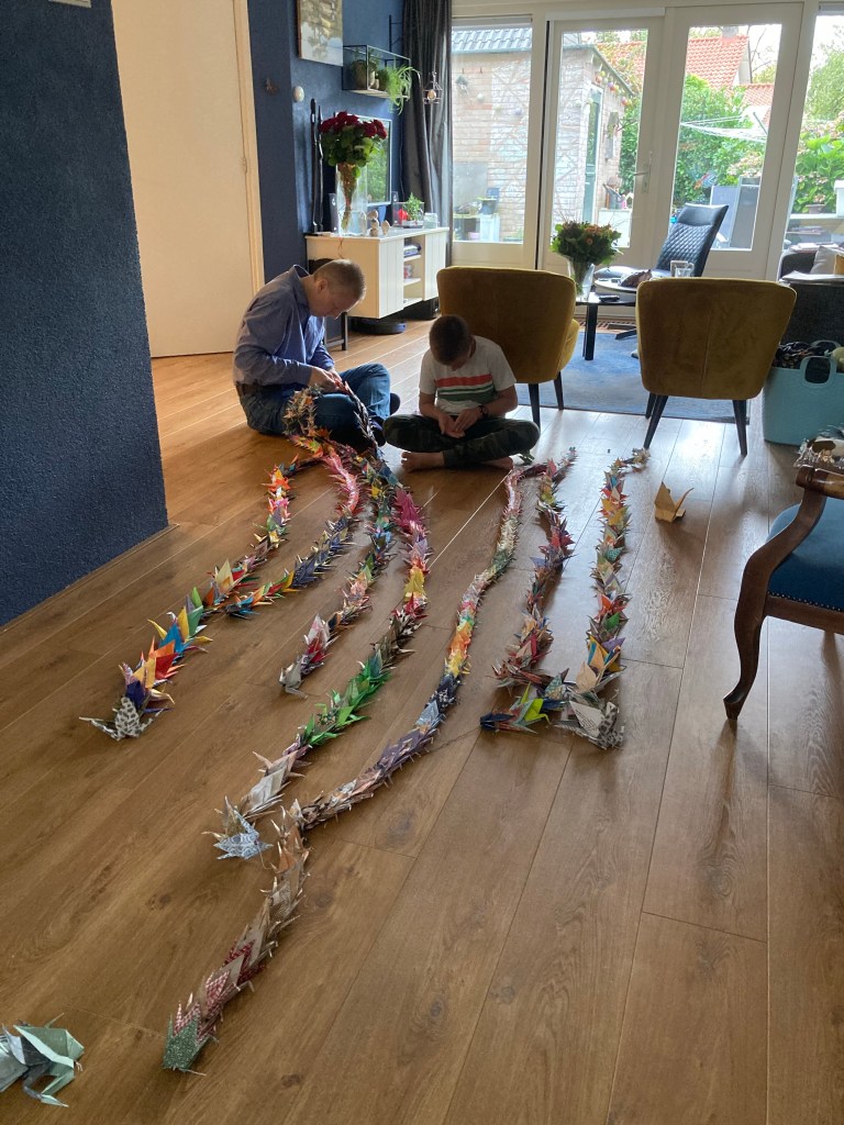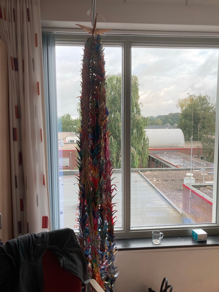 Zondagmiddag heb ik een feestje en terwijl ik op het feestje zit word ik gebeld. Hele telefoontje gemist. Gelukkig een whatsappbericht: “Mark zijn marathonshirt is voor Arjan om hem te bemoedigen met zijn zware ‘marathon’. Het symbool van de marathon Amsterdam is een kraanvogel.” Mark heeft die dag de marathon van Amsterdam gelopen en bij thuiskomst blijkt dat het shirt zelfs al door de brievenbus is gegooid. Ik vind het zo bijzonder. Overal zijn ineens kraanvogels te zien. En uit onverwachte hoek komt steun en support. Arjan is ontroerd. Het shirt wordt voor een speciale dag bewaard. En ligt zichtbaar voor Arjan over de stoel naast zijn bed.